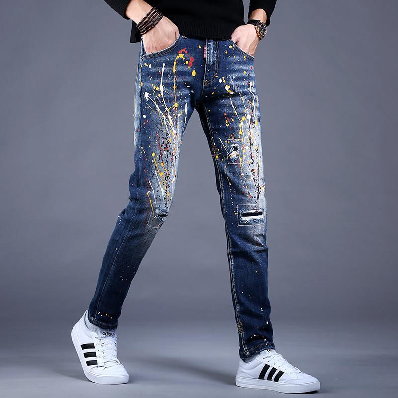 Men’s Slim Fit Denim Graffiti Ripped Jeans