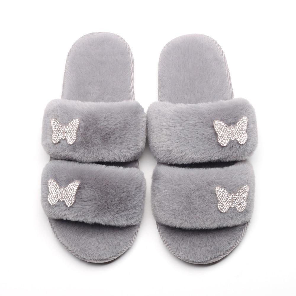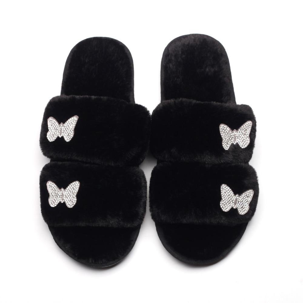 Women's Furr Slippers W/ Rhinestone Butterfly Detail