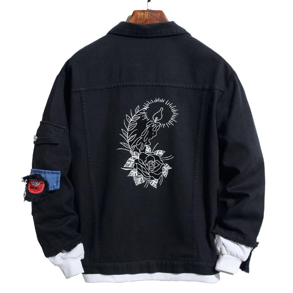 Men's Flower Print Black Denim Jacket